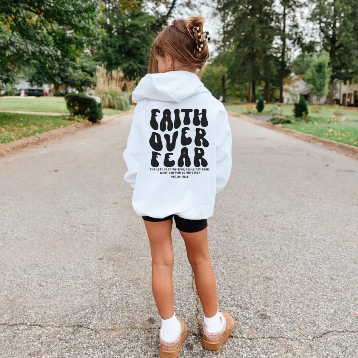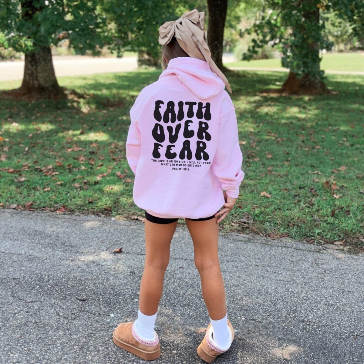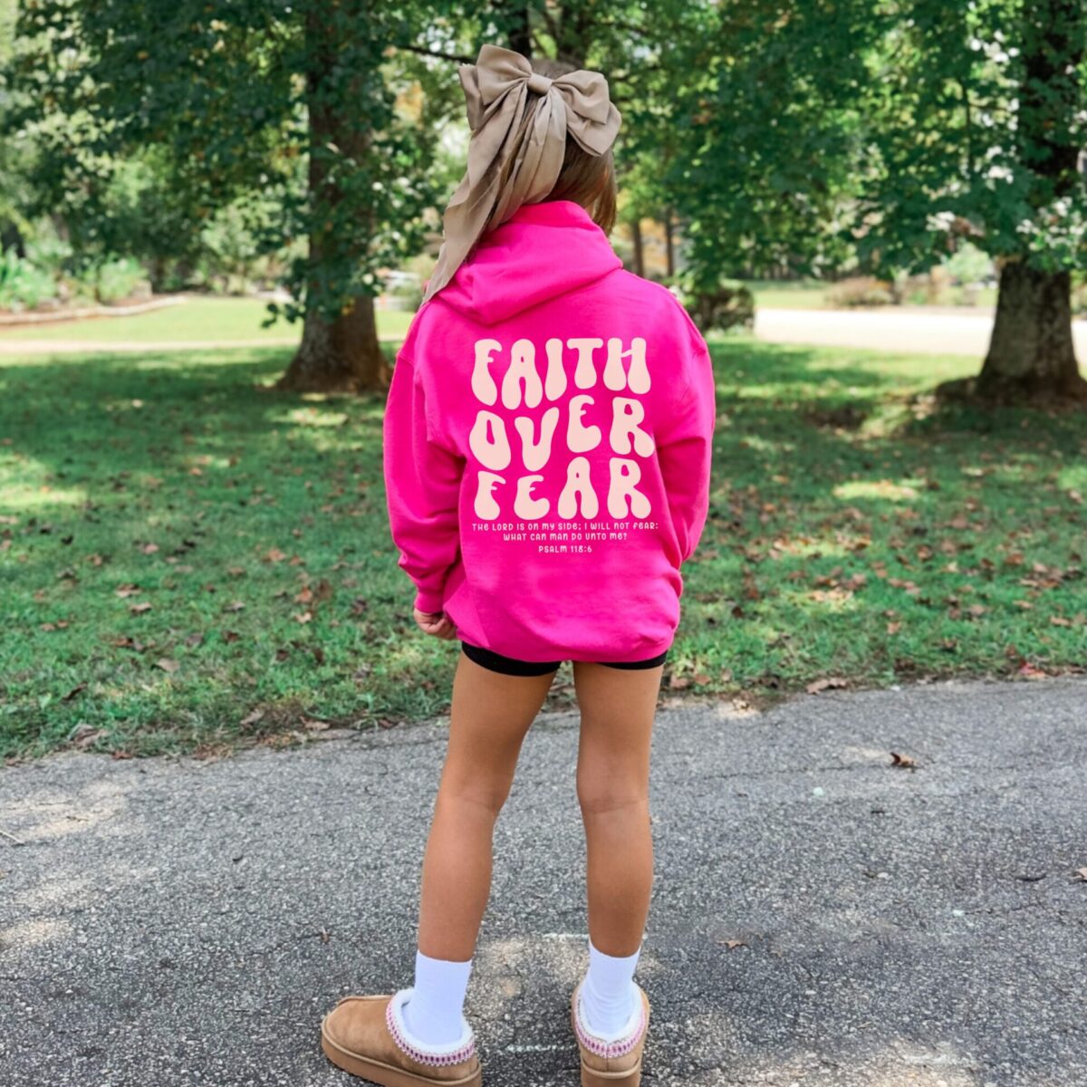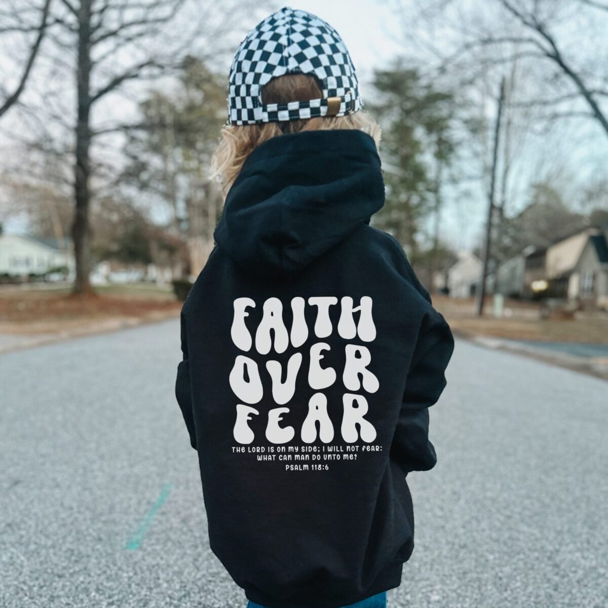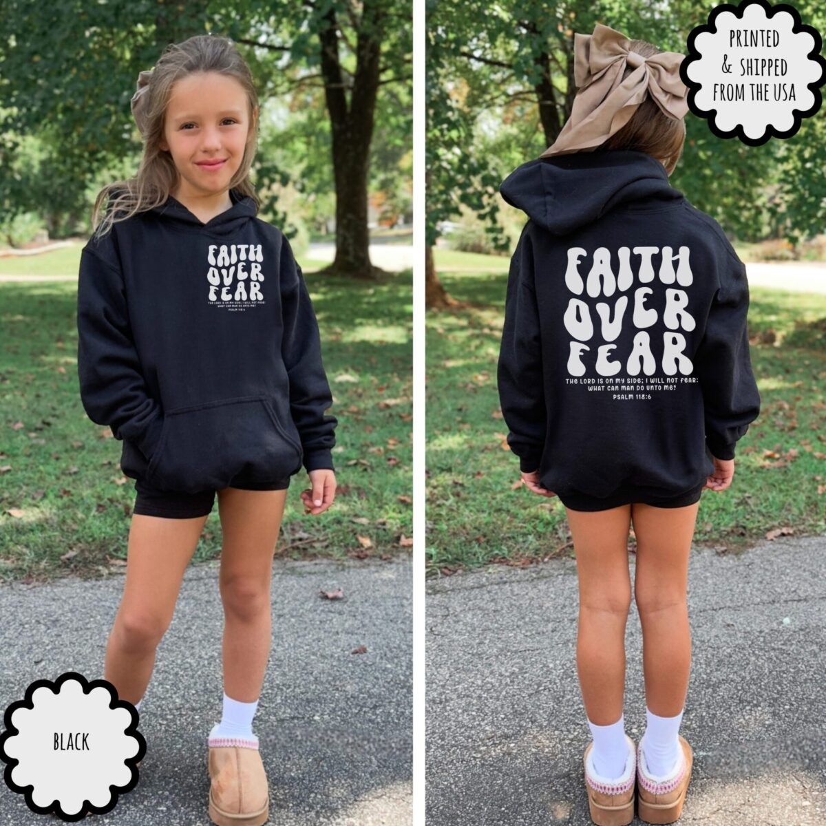 Faith over fear bubble text kids hoodie, perfect for church wear. This faith-based Christian top provides a sense of comfort and strength, making it ideal for young believers to showcase their faith. Relevant for church services, youth group activities, and holidays like Christmas and Easter. Product features – 50% cotton, 50% polyester fabric blend for durability and comfort – Spacious kangaroo pouch pocket for warmth and storage – Ages restrictions for children, making it suitable for younger wearers – – Do not dry clean – Do not iron